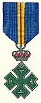 Знак ордена представлял собой стилизованный крест зелёной эмали, составленный из литеры «F», образующей монограмму короля Фердинанда I. Знак при помощи штралов в верхнем луче крепится к изображению королевской короны, которая в свою очередь крепится к орденской цепи или орденской ленте.