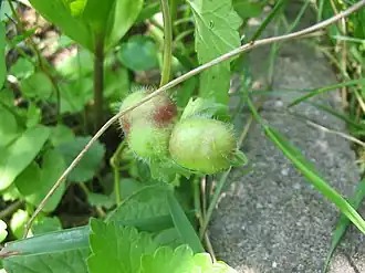 На ранних стадиях развития галл выглядит как небольшие красные пятна на листьях. Покраснение обусловлено накоплением пигментов антоцианов. Со временем галл разрастается, за счёт химически-индуцированной пролиферации клеток, и достигает размера крупной горошины. Галл имеет одну камеру выстланную питательной тканью с личинкой внутри[3]. При росте несколько близко расположенных галлов могут срастаться[4]. Эпидерма галла имеет хорошо развитые трихомы[5].