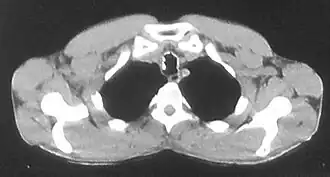 - Представляет собой экхондрозы и экзостозы, связанные с хрящами трахеи[1] (следствие перихондрита полуколец)[17][18].