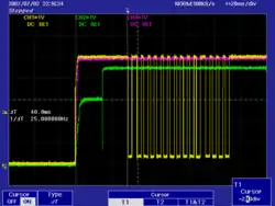 Пример вывода на экран современного осциллографа трёх исследуемых процессов с двумя курсорными засечками. Временны́е засечки отображаются вертикальными пунктирными линиями, на экран белыми символами слева выведено время между засечками — 40 мс и частота, отвечающая этому временному интервалу, — 25 Гц.