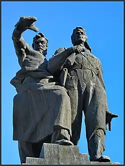 Двухфигурная композиция из скульптуры старого рабочего и молодого танкиста, символизирующая единство фронта и тыла. На постаменте надпись: