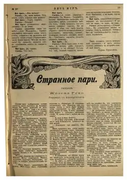 - Рассказ Ж. Рено «Странное пари». // Журнал «Весь міръ», № 26, 1911. С. 19-22.