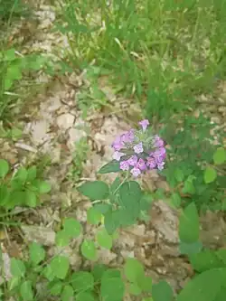 Соцветия — ложные мутовки, в количестве 1—3 на верхушке стебля, 15—30 мм в диаметре (без венчиков); цветков в дихазии 10—20. Чашечка 7—9 (9,5) мм длиной; губы б. м. равные или нижняя на 0,5—1 мм длиннее; зубцы верхней губы шиловидные, реснитчатые, 2—2,5 мм длиной, зубцы нижней губы 3—4 (4,5) мм длиной; трубка чашечки заметно изогнутая, опушена от основания на ½—⅔ длины короткими, вперед направленными, б. м. изогнутыми волосками; ниже верхних зубцов по изгибу трубка опушена длинными реснитчатыми волосками. Венчик розовый, 12—17 мм длиной; столбик обычно выставляющийся из-под верхней губы на 1—4 мм. Эремы округлые, буроватые.