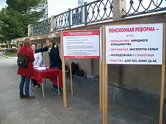 - ↑ Противники пенсионной реформы подали петиции в администрацию президента. Коммерсантъ. Москва: АО «Коммерсантъ» (4 июля 2018). Дата обращения: 29 августа 2018. Архивировано 29 августа 2018 года.