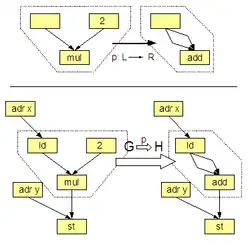 Формально система переписывания графа обычно состоит из множества правил переписывания графа в форме , где называется графом-образцом (или левой стороной), а называется заменяющим графом (или правой частью правила). Правило переписывания графа применяется к исходному графу путем поиска вхождения шаблонного графа (сопоставление с образцом, тем самым решая проблему изоморфизма подграфа) и замены найденного вхождения экземпляром заменяющего графа. Правила переписывания могут быть дополнительно упорядочены в случае помеченных графов, например, в графовых грамматиках, регулируемых строками.