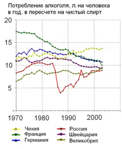 В то же время, доктор медицинских наук А. В. Немцов считает, что рост алкоголизации происходил и в других странах мира, в частности, во Франции в 1965 г. он достигал 17,3 л/чел., что привело Шарля де Голля к необходимости принятия антиалкогольных правительственных актов. Данный исследователь считает, что «после Второй мировой, приблизительно с середины 50-х годов, когда были залечены основные раны, во всём мире, но особенно в Европе и Северной Америке, вместе с ростом материального достатка начался неудержимый рост потребления алкоголя. Благополучнейшая тогда Швеция за 30 лет — с 1946 по 1976 г. — увеличила потребление на 129 %»[62].