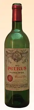 Бутылка вина Pétrus 1973 года - Сорта винограда до 2010: мерло — 95%, каберне фран — до 5%. С 2010 года используется только мерло.