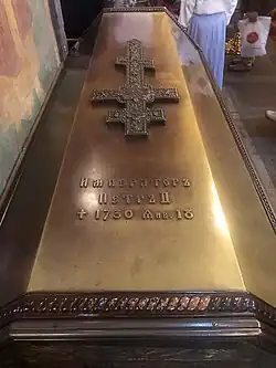 Благочестивейший и самодержавнейший государь Пётр Вторый император Всероссийский. Рождён в лето 1715 октября 12, прародительское владение приемши 1727 году 7 мая венчанный и помазанный 1728 году февраля 25 дня. Великих благ чаянием подданных своих вкратце обнадежив, изволением Божиим к вечному царствию преселися в лето 1730 иануария 18. Разсыпася радость сердец наших, обратися в плач лик наш, спаде венец с главы нашея, горе нам, яко согрешихом (Плач. 5:15-16).