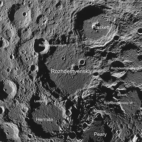 ![]() Изображение, построенное по данным лазерного альтиметра зонда Lunar Reconnaissance Orbiter. Ширина снимка — 170 км. Северный полюс — вверху, на валу кратера | |