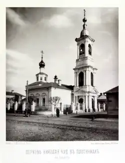 Согласно преданию, для восстановления Москвы после Смутного времени царь Михаил Фёдорович собрал плотников из разных российских городов и поселил их на Арбате, в новосозданной Плотничьей слободе. Её центром был храм Николая Чудотворца, «что в Плотниках». Первое упоминание о нём датируется 1625 годом. В конце XVII столетия он был перестроен в камне. Согласно сохранившимся документам, в 1632 году в слободе было 58 домов[1].