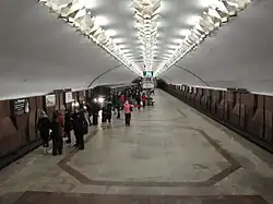 Перрон освещается при помощи люминесцентных светильников, подвешенных в три ряда к потолку оштукатуренного свода, по всей длине платформы. Светильники закрыты индивидуальными ажурными обрамлениями[11]. Путевые стены станции представляют из себя переплетенные между собой ребристые короткие блоки. Дополнительно часть из них были стянуты металлическими сварными балками[13].