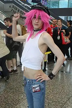 - Другой распространённый вид мужской сексуализации — изображение мужских небинарных персонажей со стереотипно женственными чертами, грациозностью, обаянием, экстравагантным внешним видом и тщеславием. Такие персонажи зачастую выполняют роль комичных. Связывание сексуальности с феминностью истекает из стереотипного мышления того, что сама сексуальность в её классическом понимании связана с женственностью и несовместима с мужественностью[107]. Примеры таких персонажей — Вега из Street Fighter, Меттатон из Undertale, Макси и Рафаель из Soul и Сефирот из Final Fantasy[103].