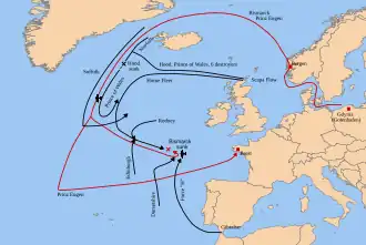 «Бисмарк» шёл к сражению с серьёзными повреждениями: ещё 24 мая, за два дня до боя, в ходе сражения в Датском проливе корабль получил три попадания, в ходе которых был повреждены трубопровод к носовым топливным цистернам и турбогенераторное отделение[2]. Вследствие этих повреждений находившийся на борту корабля адмирал Гюнтер Лютьенс принял решение возвращаться в Брест для ремонта[3]. Пытаясь оторваться от преследовавших его линкора «Принц Уэльский» и крейсеров «Норфолк» и «Саффолк», командующий операцией адмирал Лютьенс принял решение отделиться от крейсера «Принц Ойген». 25 мая британцы потеряли контакт с линкором, который двинулся курсом восток-юго-восток к французскому побережью, и из-за ошибочных предположений об уходе линкора в Норвегию пошли на северо-восток.