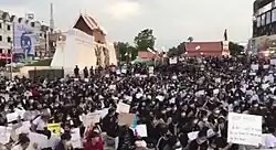 На митинге, который был назван одним из крупнейших протестов за последние годы,[79] 19 сентября протестующие собрались в университете Таммасат после того, как ворота университета были открыты в результате противостояния[80][81]. Протестующие заняли площадь Санам Луанг во второй половине дня[82] и остались там на ночь, при этом на митинг пришли до 100 000 демонстрантов[83][84][85], в то время как полиция мобилизовала более 10 000 офицеров[86]. 20 сентября протестующие установили мемориальную доску, символизирующую демократию, в Санам Луанг, которая должна стать преемником оригинальной мемориальной доски, установленной на Королевской площади во время сиамской революции 1932 года, которая в свою очередь исчезла в 2017 году[87][88]. Протестующие перешли от изначально заявленной цели о шествии к Дому правительства, который был сильно забаррикадирован, и вместо этого представили свои требования президенту Тайного совета через начальника столичного полицейского управления перед тем как разойтись[89]. Сообщений о насилии не поступало, а лидер протеста Парит Чиварак призвал к всеобщей забастовке 14 октября в ознаменование тайского народного восстания 1973 года[90]. Мемориальная доска была демонтирована полицией менее чем через 24 часа после её установки[91], однако с тех пор она распространилась как онлайн-мем[92]. Некоторые международные СМИ описали митинг как открытый вызов правлению Вачиралонгкорна[93], а против лидеров протеста были поданы жалобы, включая обвинение в оскорблении величества[94].