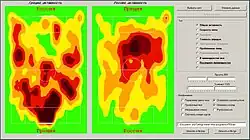 Другая разновидность программы обработки реестра футбольного матча — программа построения теплограмм[16]. Она создаёт теплограммы — цветовое изображение плотности распределения различного рода статистических командных и индивидуальных показателей. Основная её задача — визуализация основных технико-тактических характеристик команд и игроков. Теплограммы это своего рода рентген футбольного матча. По этой причине они нашли применение в очень важном элементе современного футбольного матча и получившем название «Программа управления матчем».