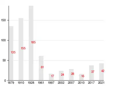 | 1879 | 1910 | 1928 | 1961 | 1997 | 2002 | 2007[15] |