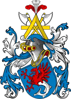 Щит увенчан коронованным дворянским шлемом. Нашлемник — деревянное стропило с перекладиной наподобие литеры А, наложенное на скрещенные серебряные топоры с золотыми топорищами, вершина которого украшена тремя страусиными перьями: в середине серебряное, справа голубое, слева красное. Намет голубой с серебром.