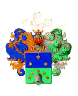 Щит пересечён. В первой, лазоревой части, три золотые о шести лучах звезды 1 и 2 (изм. польский герб Карп). Во второй, зелёной части, серебряный улей, сопровождаемый пятью золотыми пчёлами.