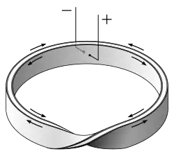 Два ленточных проводника одинаковой длины прикреплены на противоположных сторонах полосы диэлектрика. Затем сборке придается один поворот, и концы соединяются, образуя поверхность Мебиуса. Концы проводников спаяны вместе, а выводы резисторов присоединены к прямо противоположным паяным соединениям. Ток, подаваемый на клеммы, будет распространяться в противоположных направлениях, так что электромагнитные поля нейтрализуют друг друга, в результате чего получается по существу неиндуктивный, не реактивный резистор с низкой постоянной времени [3].