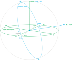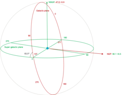 - Плоскость проходит через Землю, поскольку сверхгалактическая плоскость определяется как плоскость, наблюдаемая с Земли.