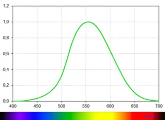 где — относительная спектральная световая эффективность монохроматического излучения для дневного зрения, физический смысл которой заключается в том, что она представляет собой относительную чувствительность среднего человеческого глаза к воздействию на него монохроматического света, а — максимальное значение спектральной световой эффективности монохроматического излучения. Максимум располагается на длине волны 555 нм и равен единице.