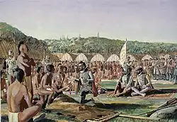 Прибытие Картье в деревню ирокезов на реке Ошелага. Художник Лоуренс Робб Бэтчелор (1933)