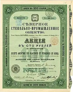 - ↑ Северное стекольно-промышленное общество. Акция на предъявителя в 100 руб., г. С.-Петербург, 1912 г. : Из коллекции Банка «ЦентроКредит» : [арх. 20 декабря 2016] // Скрипофилия.