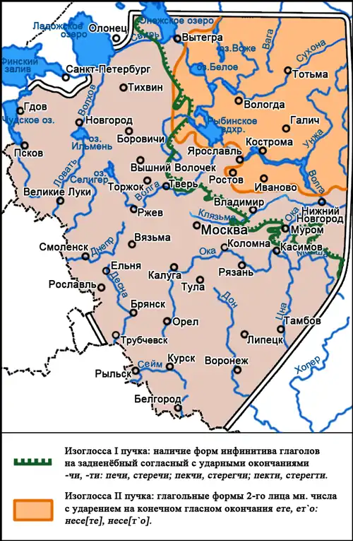 Одними из наиболее ярких явлений, характерных для говоров I пучка изоглосс данной зоны, являются: Распространение таких слов, как мост (сени), бо́льно наряду с менее распространённым словом ши́бко (очень)[8]; местоимение 3-го лица в форме именительного пад. мн. числа оне́, в говорах северной части диалектной зоны сосуществует с формой они́, отсутствует в Онежской группе говоров. Произношение слов: внук с начальным м — [м]нук (отсутствует в северной части диалектной зоны); кукушка с предударным гласным о — кок[у́]шка; а также произношение нерегулярно распространённых слов: [де́р']гат' (дёргать), [л’о]шш или [л’о]ш’ш' (лещ), [д’о́]ржим (держим) и др. Употребление форм инфинитивов с конечным ударным -и от основ на задненёбный согласный: печи́, стеречи́ или пекчи́, пекти́, стерегчи́, стерегти́ и т. п. (см. изоглоссу на карте) (такие же формы инфинитивов распространены в юго-западной части западных среднерусских акающих говоров) Также к диалектным явлениям I пучка изоглосс относят: Исключительное распространение форм инфинитива с суффиксом -ти глаголов типа нести́, везти́, идти́ (такие же формы инфинитивов исключительно распространены в части западных среднерусских говоров, на других территориях употребляются формы типа нест' , везт' наряду с нести́, везти́). Распространение разрозненными ареалами инфинитивов кла́сти, ходи́ти. Нерегулярно распространённое явление употребления предлога по с винительным пад. неодушевлённых и одушевлённых существительных в конструкциях с целевым назначением: пошёл по орехи, пошёл по топор и т. д.[1]
