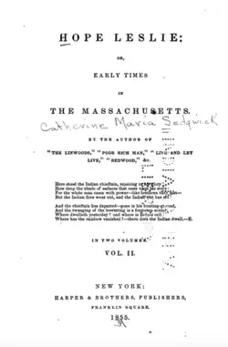 - Hope Leslie; or, Early Times in the Massachusetts (1827)