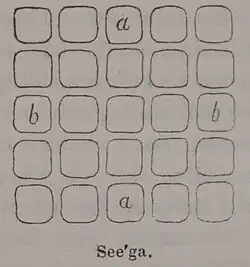 • Согласно разным описаниям, возможны два варианта расстановки. Первый: так же, как в сидже. Второй: первые четыре фишки ставят «крестом» на концах центральных горизонтали и вертикали. Первый игрок ставит справа и слева, второй — сверху и снизу (см. вторую иллюстрацию). Затем начинается собственно расстановка.