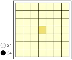 • Игроки попеременно выставляют по два камня на любые две клетки поля, кроме центральной. При этом стараются занять более выгодные позиции, с учётом того, кто будет производить первый ход во второй фазе игры.