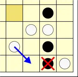 • Если после хода камень противника попал между двумя камнями ходящего игрока (захвачен стражниками), то он считается съеденным и убирается с поля. Причём съедаются сразу все захваченные камни по всем направлениям (по вертикали, по горизонтали и по диагоналям). Теоретически их может быть до семи. Есть необязательно, но уже съеденные камни оставлять на поле нельзя. Причём камни, изначально зажатые, между камнями противника не являются съеденными, так же как и свой камень, поставленный игроком между двумя камнями противника.