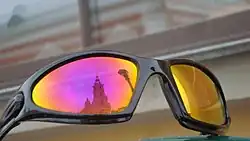 Очки 2000-х годов с интерференционным зеркальным покрытием. В сравнении с предыдущими разница малозаметна, но она есть: при искусственном освещении отражение имеет радужные оттенки