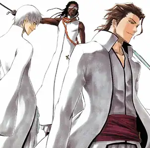 Слева направо: Гин Ичимару, Канамэ Тосэн и Соскэ Айдзэн в качестве лидера арранкаров. Иллюстрация Тайто Кубо из второго руководства по персонажам Bleach Official Character Book 2 MASKED, изданного в 2010 году[7].