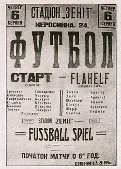 - 5 июля «Старт» — «Спорт» (украинское спортивное общество) — 8:2. (Состав «Старта» согласно афише: Трусевич, Клименко, Свиридовский, Балакин, Сухарев, Ткаченко, Гончаренко, Чернега, Комаров, Коротких, Путистин, Кузьменко, Сотник, Тютчев.)