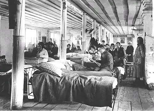 Самым распространённым жилищем в начале 1930-х годов среди строителей был одноэтажный барак. Бытовые условия в бараках отличались. В некоторых из них зимой было очень холодно. Многие обитатели бараков регулярно жаловались со страниц газет на ужасные бытовые условия: отсутствие кипятка, постельного белья, мебели и дров, скученность помещений, наличие клопов, низкое качество строительства[33]. Некоторые бараки со временем делили перегородками на отдельные комнаты.