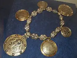 Состоит из 6 серебряных позолоченных круглых блях-медальонов: 2 больших, 2 средних и 2 малых. Каждое из них имеет разные изображения: