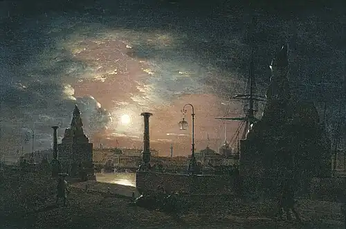В 1830 году был разработан проект создания гранитной набережной на Васильевском острове западнее Исаакиевского наплавного моста. В 1831 году напротив здания Академии художеств архитектором Константином Тоном была спроектирована пристань в классическом «греческом» стиле. По замыслу художника её должны были украшать скульптуры укротителей коней Петра Клодта. Однако цена изготовления статуй в 425 тысяч рублей оказалась слишком велика для Академии художеств. В итоге было решено украсить пристань приобретёнными в Египте сфинксами. Для этого Константин Тон переделал проект, изменив пропорции спуска к воде[18].