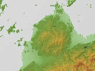 Наивысшей точкой полуострова является вулкан Хигаси-Самбогамори (東三方ヶ森, 1233 м), также есть вершины Нарабара (楢原山, 1042 м), Мёдзингамори (明神ヶ森, 1217 м)[1]. На западе полуострова расположена гора Таканава (高縄山, 986 м), на которой стоит средневековый храм Таканава-дэра[1][2]. С нагорья стекают реки Накаяма (中山川), Даймёдзин (大明神川), Тонда(頓田川), Содзя (蒼社川), Сигенобу и другие; на многих были построены плотины и водохранилища[1].