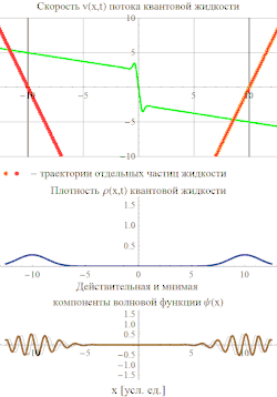 Уравнения (5) являются основными уравнениями гидродинамического описания квантовой механики. Вся их квантовость "спрятана" в потенциале Q, который задает нелокальное, неаддитивное и в существенной степени сингулярное взаимодействие между частицами квантовой жидкости. В частности, как сам квантовый потенциал, так и его градиент обычно обращаются в бесконечность в точках, где , благодаря чему частицы квантовой жидкости могут мгновенно набирать бесконечные скорости и проскакивать через "сухие" места, где обращается в нуль. Из-за этого динамика, определяемая уравнениями (5), обладает качественными отличиями от классической. В качестве наглядного примера интересно рассмотреть формирование интерференционной картины двумя свободно распространяющимися навстречу друг другу гауссовскими волновыми пакетами. Напомним, что в стандартной интерпретации квантовой механики интерференционная картина возникает благодаря принципу квантовой суперпозиции, позволяющему волновым функциям пакетов проходить сквозь друг друга, не взаимодействуя. В то же время, потоки частиц квантовой жидкости не могут пересекаться. В результате интерференция возникает как результат сложной картины рассеяния сталкивающихся потоков частиц, при котором их скорости достигают бесконечных значений.