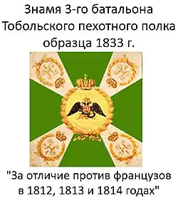 Согласно рукописи "Описание одежды, снаряжения и вооружения Российских войск" (по высочайшему повелению, составленной генерал-крикс-комиссаром Бибиковым 4-м, ответственным за снабжение и денежное довольствие армии в 1730 году) знамёна Тобольского пехотного полка имели красное древко, зелёное полотнище, нашитые красные "фламы". Такая же расцветка принята и для штатных знамён 1741 года.