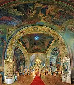Внутри Преображенского храма привлекают внимание фрески, особенно впечатляюща картина Страшного Суда. Церковь создана в русско-византийских архитектурных формах «тоновского» направления. Сооружение крестовое в плане, с полуциркульной апсидой, пятикупольное (боковые главы поставлены по углам центрального объёма), с колокольней над притвором, завершенной шатром[5].