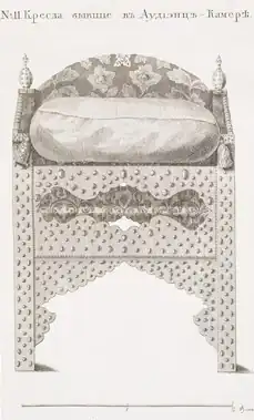 В «Описи Большому государеву наряду в Государевой большой казне царя Михаила Федоровича 7150 (1642 г.)» трон упоминается как «место персицкое оправлено золотом с каменьем с бирюзами…»[1].