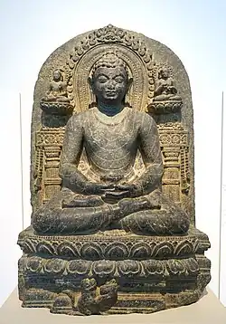 Другие композиции показывают стебли, бутоны и цветы рядом с главной фигурой.[17] Они могут оканчиваться на цветке, удерживающем главную фигуру,[1] особенно если это Авалокитешвара или Вишну 5-го или 6-го века (оба также имеют эпитет Падмапани, «держатель лотоса»),[18] или на другом троне лотоса, к которому протянута рука основной фигуры, кисть которой демонстрирует жест мудры. В качестве альтернативы стебли могут подниматься вверх, чтобы поддерживать троны лотоса под более мелкими фигурами, как в ранней терракотовой доске 1-го в. до н.э., показанной выше, где стебли поднимаются сбоку, чтобы поддержать слонов, прославляющих Гая-Лакшми.[7] Каменный рельеф Санчи, показанный на фото, имеет подобную композицию с королевой Майей, матерью Будды. Над или под водой стебли могут поддерживаться маленькими фигурами нага.[19]