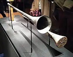 Бронзовая труба была подробно исследована Джереми Монтегю в 1970-х годах. Она состоит из двух частей. Конический корпус изготовлен из прокатанного листа медного сплава толщиной от 0,2 до 0,25 мм. Он спаян по всей длине с помощью «очень искусно спаянного меандрового соединения… отшлифованного до идеальной поверхности», однако внутри он «слегка шероховатый», что указывает на то (как и следовало ожидать от церемониального инструмента), что внешний вид имел большее значение, чем акустические характеристики. Раструб изготовлен из другого, более тонкого материала: сплава золота, похожего на электрум, с содержанием золота от 0,1 до 0,13 мм толщиной. На нём нет видимых швов, вероятно, «его полировали до тех пор, пока золото не растеклось». Кольцо толщиной в 3,25 мм, образующее мундштук, вероятно, также было изготовлено из электрума. Кольцо, по-видимому, не было закреплено на корпусе, и Монтегю предположил, что, хотя на инструменте можно было извлечь три ноты, самая высокая нота не должна была звучать; помимо того, что её извлечение требовало усилий, конструкция трубы едва её выдерживала. Самая низкая нота слышна недалеко, что позволило Монтегю предположить, что в ритмическом сигнальном коде использовалась только средняя нота[6].