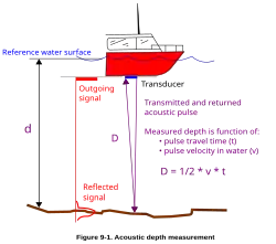 Он предполагает передачу акустических волн в воду и регистрацию временного интервала между испусканием и возвратом импульса; полученное время распространения (отклика) вместе со знанием скорости звука в воде позволяет определить расстояние между гидролокатором и целью. Эта информация затем обычно используется в целях навигации или для определения глубины для построения карт. Расстояние измеряется путём умножения половины времени от исходящего импульса сигнала до его возвращения на скорость звука в воде, которая составляет примерно 1,5 километра в секунду [T÷2×(4700 футов в секунду или 1,5 километра в секунду)]. Для прецизионных приложений эхолотирования, таких как гидрография, скорость звука также обычно необходимо измерять путём помещения в воду зонда скорости звука. Эхолотирование – это, по сути, специальное применение гидролокатора, используемое для определения местоположения дна. Первый практический глубиномер был изобретён Гербертом Гроувом Дорси и запатентован в 1928 году[8].