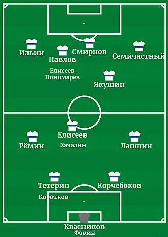 | «Динамо» Москва: Квасников - Тетерин, Корчебоков - Лапшин, Елисеев, Рёмин - Семичастный, Якушин, Смирнов, Павлов (75' А.Пономарёв), Ильин |