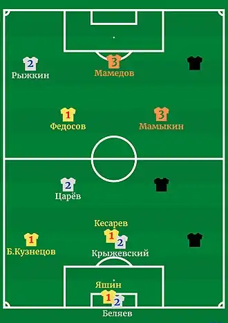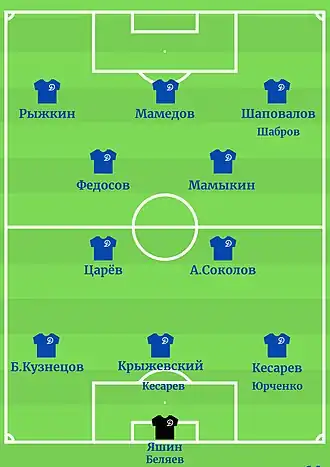 | «Динамо» Москва: Беляев - Кесарев, Крыжевский «Металлург» Запорожье: Кроликов - П.Пономарев, Донец, Осадчий - Николаюк, Туряница - Зозуля, К.Бондаренко, В.Сорокин |