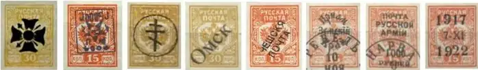 В конце 1919 года в Северной Области (под управлением генерала Е. К. Миллера) была изготовлена серия из семи марок оригинального рисунка (Mi #I-VII). Беззубцовые марки были отпечатаны литографским способом на белой бумаге без водяных знаков. На них изображён герб Российской Республики и даны надписи: «Россія Сѣв. Армія». Этот выпуск почти 100 лет считался фантастическим. Тем не менее эти марки являются легитимными, но не успевшими попасть в обращение в связи с занятием Красной Армией Архангельска в начале 1920 г. Все марки существуют с фальшивыми гашениями, выполненными сине-серой краской.