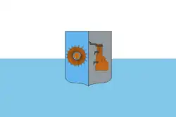 «Прямоугольное двухстороннее полотнище с отношением ширины к длине 2:3, состоящее из двух равных вертикальных полос голубого (у древка) и белого цвета. В середине голубой полосы — жёлтое сияющее солнце, а в середине белой — жёлтый руль с чёрной рукоятью и таковыми же креплениями».